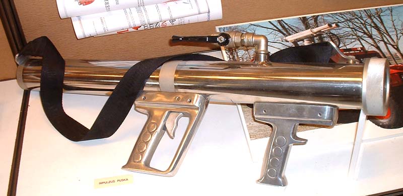 "Impulse Gun" puts out the fire by water spray. This is a Hungarian invention suitable puting out fire on persons. You can see it in the Firemen's Museum.